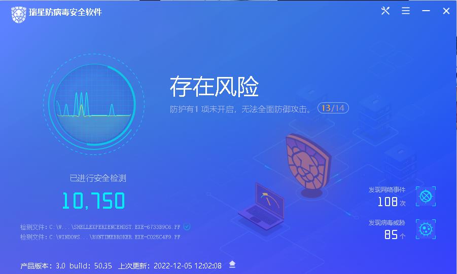 操作系统及补丁情况:WIN10 21H2(操作系统内部版本 19044.1889)浏览器及版本:搜狗浏览器 11.0.1.34700(已去除搜狗保护)瑞星软件版本:3.0 BUILD 50.24涉及的其他软件及版本:WIN11、DiskGenius 5.4.6.1441 x54问题现象: 比如目前的信息是4号的,但是现在是五号了,依然是显示四号的数字。。。。。那万一,一年也不变。。。客户习以为常。。 就像狼来了的故事,习惯了,,假如当天确实发生了啥情况,用户反而会忽略。。