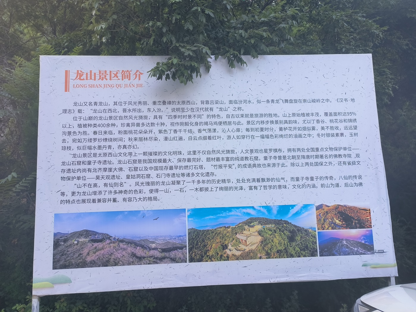 天龙山原名方山,海拔1370米,位于晋祠西11公里处,560年(北齐皇建元年)兴建天龙寺,山以寺得名。上世纪20年代国内军阀混战列强入侵,在内忧外患的大环境下天龙山石窟里众多文物被外国文物窃贼盯上了,大量的佛首流落海外,如今的石窟已经残破不堪。所以看到祖国今日的繁荣富强,我为我是一个中国人感到骄傲和自豪。
